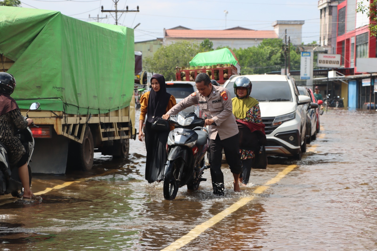 ” Personil kami langsung terjun ke titik banjir tepatnya di area jalan raya Pawan 1 di dekat turunan jembatan. Di area tersebut hampir setiap kendaraan bermotor terutama sepeda motor jenis matic, mengalami mogok dikarenakan kemasukan air.” jelas Kapolres Ketapang