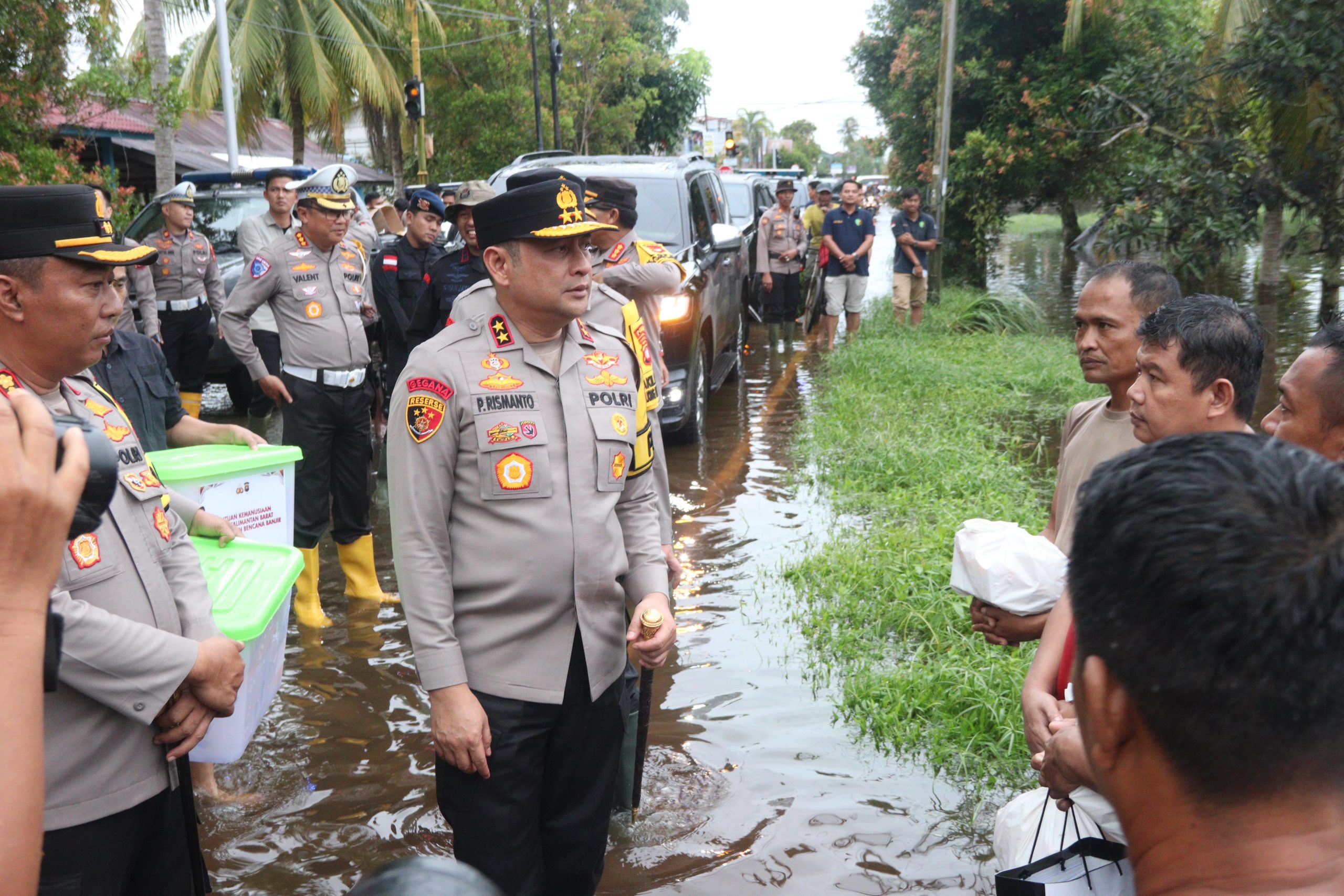 Untuk menuju lokasi pengungsian, rombongan Kapolda berjalan kaki 3 km sepanjang genangan air di jalan Bengkayang – Mempawah untuk melakukan peninjauan dan penyisiran di lokasi banjir, memberikan bantuan di beberapa titik banjir, dan mengunjungi aspol anggota Polres Mempawah yang terdampak banjir, lokasi pengungsian di mess Pemda Mempawah, gedung PNPM dan sekolahan setempat untuk memberikan bantuan langsung bagi warga terdampak banjir.