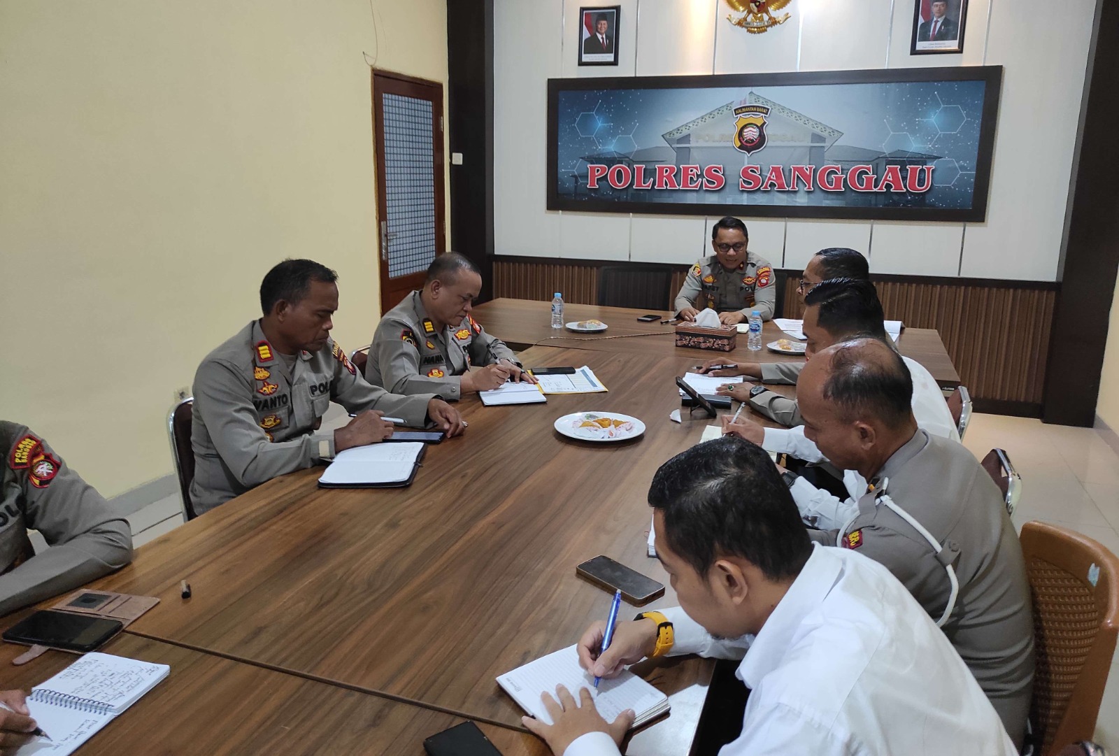 Rapat tersebut dipimpin langsung oleh Wakapolres Sanggau, Kompol Yafet Efraim Patabang, S.H., S.I.K., M.H., serta dihadiri oleh Para Pejabat Utama (PJU) Polres Sanggau, perwira dan personel jajaran. Rapat ini bertujuan untuk mematangkan semua aspek pelaksanaan kegiatan skala nasional yang dijadwalkan akan melibatkan Presiden Republik Indonesia secara virtual melalui sambungan Zoom.